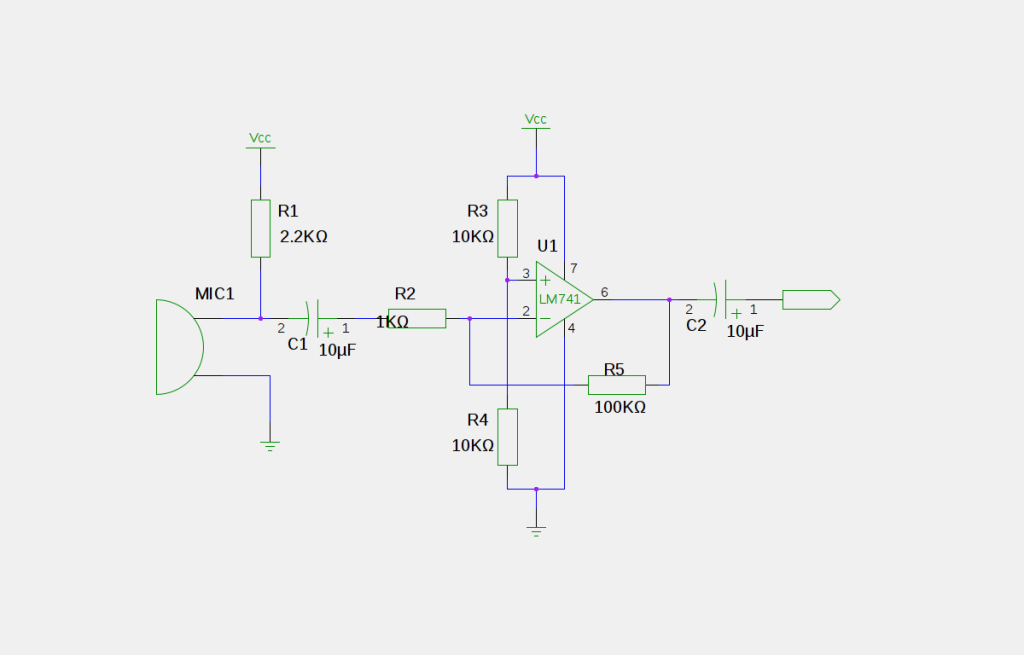 Fast-forward to this afternoon, when I picked up an electret microphone from my local electronic parts supplier. I had also come across this StackExchange post about how an electret mic needs to be amplified before its signal gets sent into the Arduino. The chosen answer contains this schematic:
